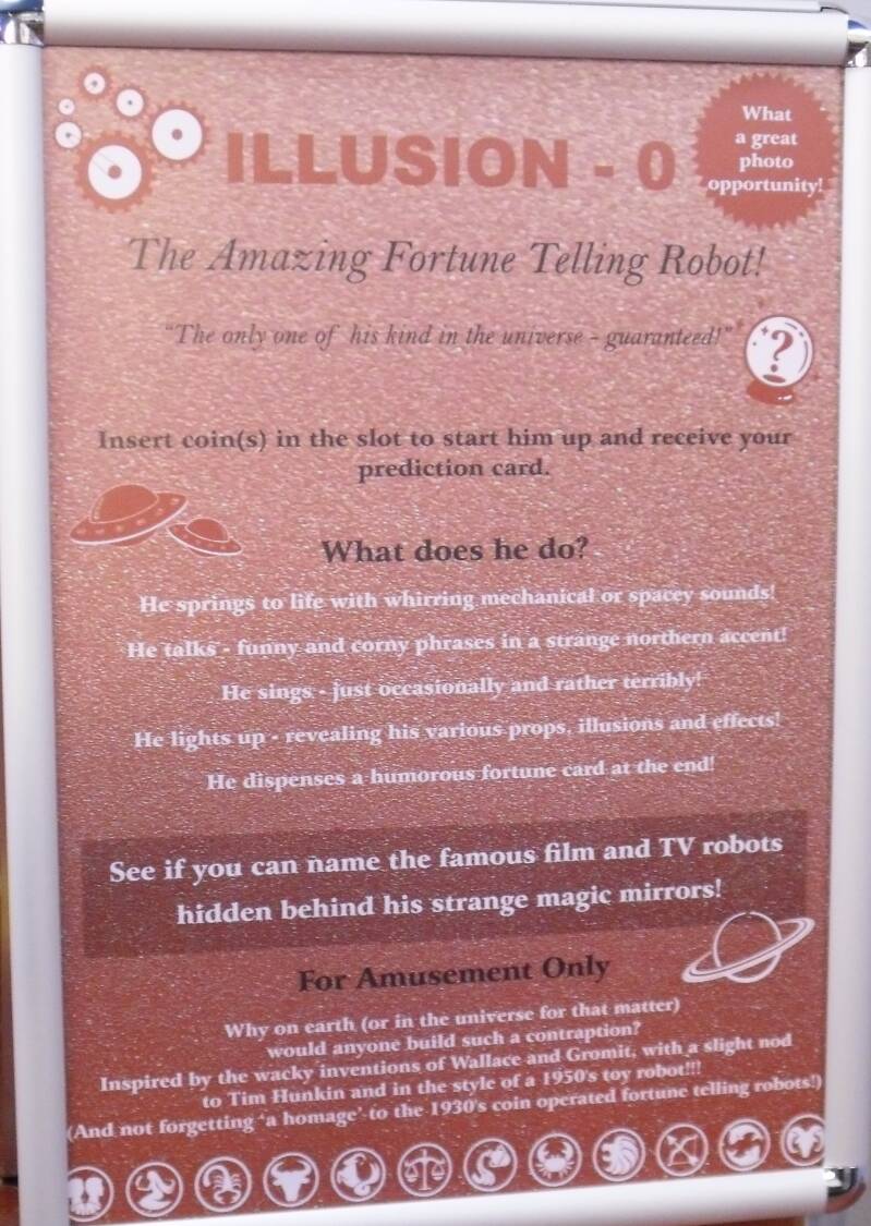 A specially created one-off piece, loosely based on the robot fortune-telling machines of the 1930s, though in the style of the vintage 1950s tin plate, clockwork robot toys! Featuring an array of built-in props, illusions, lights and sounds. He also dispenses a fun and humorous fortune card to each and every patron!